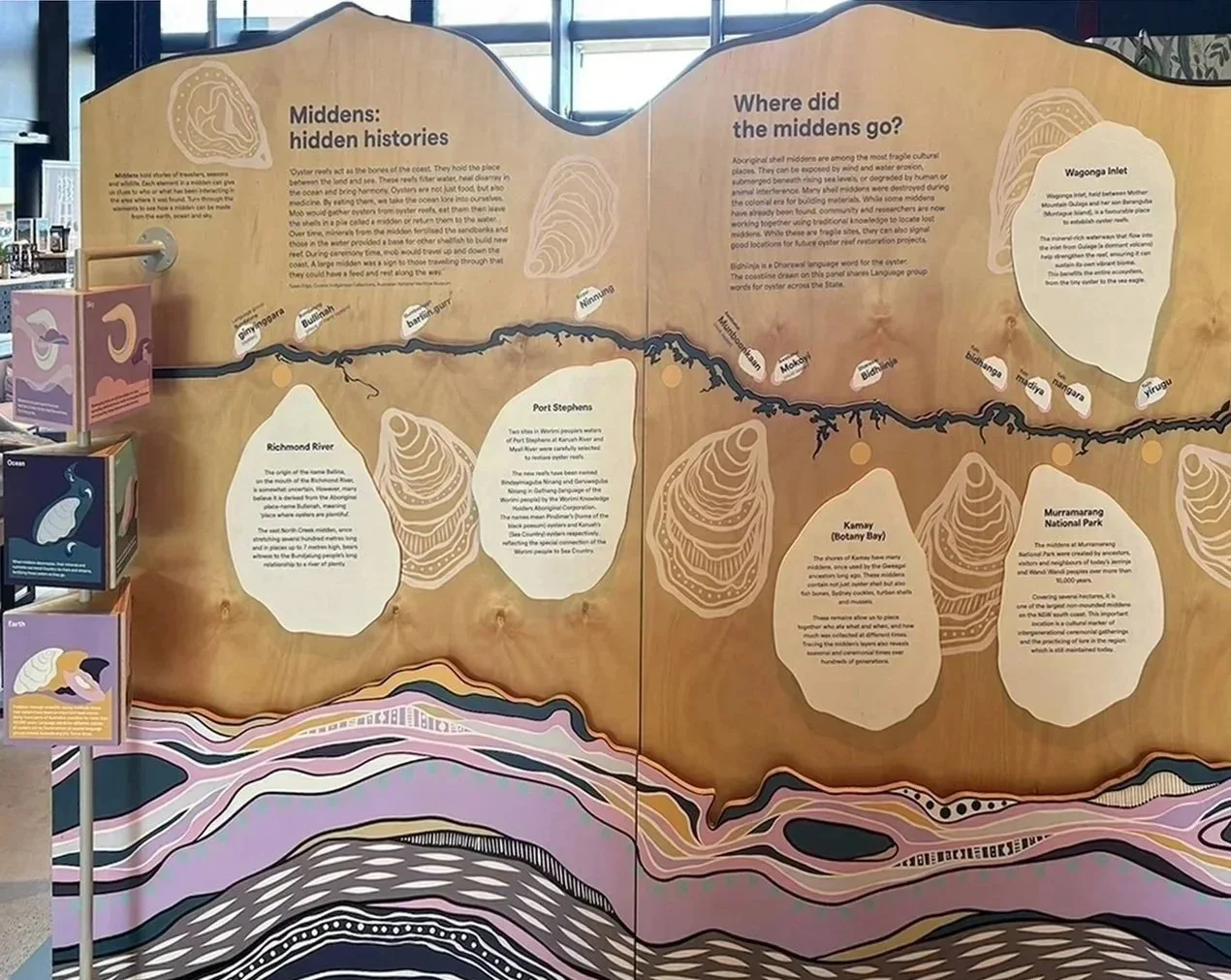 Developed by the Australian National Maritime Museum in collaboration with the NSW Department of Primary Industries, Bidhiinja explores the forgotten history of oyster reefs and the critical role they once played in coastal environments and communities. The exhibition draws together science, history and cultural knowledge to tell the story of these remarkable ecosystems and why their restoration matters.